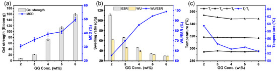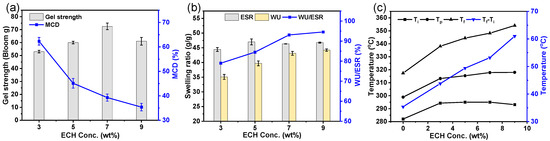 Generally, the cross-linking density of hydrogels increases with the concentration of the cross-linker within a certain range [41], and the effect of ECH on the GEH characteristics is shown in Figure 4a. The mechanical strength of the GEHs exhibited an initial increase followed by a subsequent decrease upon increasing the concentration of the cross-linker, while the MCD of the GEHs demonstrated a significant reduction with an increase in the concentration of the cross-linker. As shown in Figure 4b, the ESR of the GEHs first increased and then remained constant with an increase in the cross-linker concentration, while the WU of the freeze-dried GEHs gradually increased. At the same time, the WU/ESR values showed a gradual increase, indicating the enhanced water uptake capacity of the freeze-dried GEHs, which was due to the overhanging modifications formed by the large amount of ECH on the gum backbone. This increased the number of hydroxyl groups and enhanced water absorption [42]. As seen from the thermal stability data (Figure 4c), the thermal stability of the GEHs was enhanced through the addition of a cross-linker. Within the range of the experimental concentration, the maximum decomposition rate temperature, the final decomposition temperature, and ΔT(Tf − Ti) showed an increasing trend.