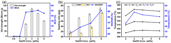 According to the cross-linking mechanism (Figure 1), the amount of NaOH, as an activator of polymerization, affects the cross-linking reaction [43,44]. In addition, GG chain breakage in alkaline solutions affects the cross-linking density of hydrogels and their properties [45,46]. As shown in Figure 5a, both the mechanical strength and MCD of the GEHs initially increased and then decreased with an increase in the NaOH concentrations. Figure 5b shows that, as the NaOH concentration increased, the ESR and WU of the GEHs initially decreased before subsequently increasing, whereas the WU/ESR ratio gradually increased.