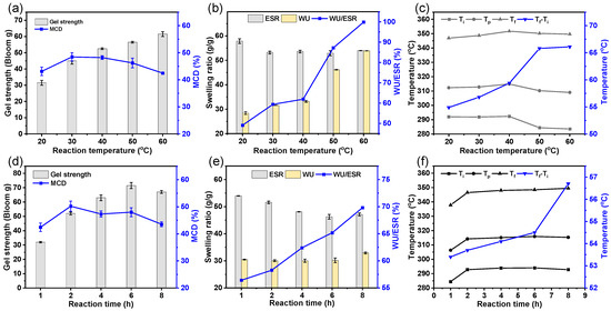 Effects of reaction temperature on the (a) mechanical properties and MCD, (b) swelling and water uptake properties, and (c) thermal stability of the GEHs; effects of reaction time on the (d) mechanical properties and MCD, (e) swelling and water uptake properties, and (f) thermal stability of the GEHs.