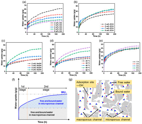 Effects of (a) GG concentration, (b) ECH concentration, (c) NaOH concentration, (d) reaction temperature, and (e) reaction time on the water uptake curves of the GEHs. (f) Conceptual framework for the water absorption process. (g) Schematic diagram of the network structure of freeze-dried ECHs with respect to water adsorption.