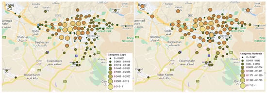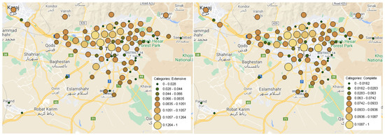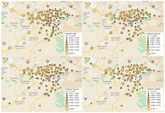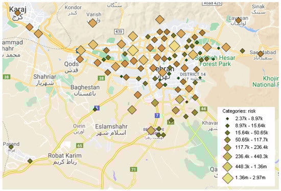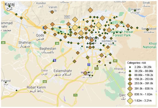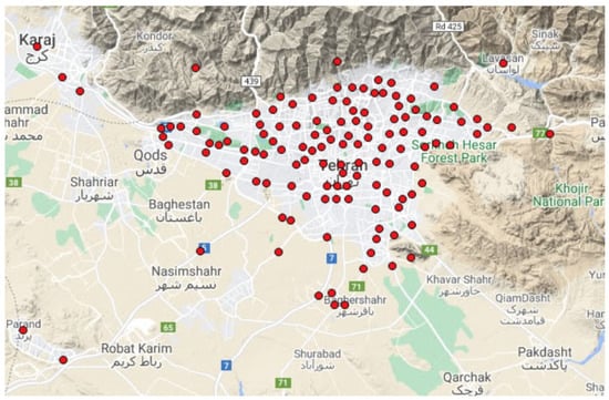 Owing to the large number of bridges, it is not possible to manually determine the spatial coordinates of the bridges correctly and without error. Therefore, the Google Maps API was used to solve this problem. Using the GeoCoding and Inverse GeoCoding features in this API, the bridge location can be obtained from the geographical coordinates. In addition, the geographical coordinates can be attained from the bridge location, respectively. Given that the address field is complete for all bridges within the databank, the geographical coordinates of all bridges were determined through the Inverse Geocoding feature. The distribution of these bridges across Tehran province is shown in Figure 1.
