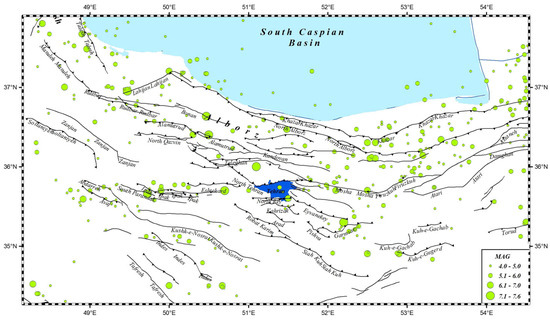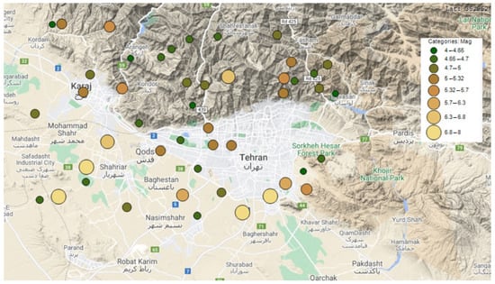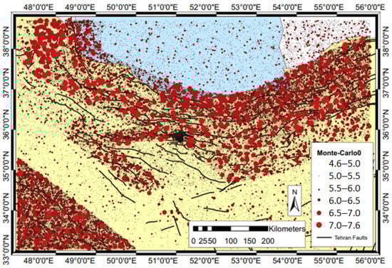 The ten-thousand-year catalog of earthquakes used in this study is based on a comprehensive database containing all possible seismic scenarios for the Tehran region. This database is an artificial earthquake catalog created by Zolfaghari (2014) using the Monte Carlo simulation approach and contains 84,000 independent earthquakes (Figure 2) [13]. Each of these scenarios contains the magnitude, geographic location, focal depth, and geometric features of the fault. Such a catalog provides a complete distribution of events in time, space, and magnitude. However, its implementation for risk analysis and damage assessment studies requires high computational power, especially when other sources of uncertainty are included in the calculations.