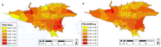 The software developed in this study allows the shear wave velocity to be defined in terms of zone contours or discrete points (it can perform 3-D interpolations to calculate the shear wave velocity at any desired point). However, due to the lack of reliable information in this case, the shear wave velocity in this study was assumed to be constant and equal to 760 m/s. In addition, the soil amplification factor for the entire area was assumed to be 1.