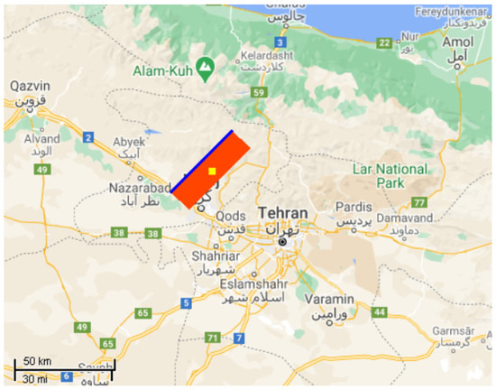 In addition, in order to use the next-generation attenuation relations, the distance (several types of distances are required in each relation) must be calculated accurately. In particular, for larger earthquakes with high degrees of propagation, the exact characteristics of the fault rupture must be determined and the distance calculated on this basis. In this study, the rupture area for each of the earthquake scenarios was modeled as a rectangular 3-D plane, and its exact coordinates were calculated accordingly (Figure 6). The calculation process for the coordinates of the fault zone is as follows: