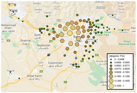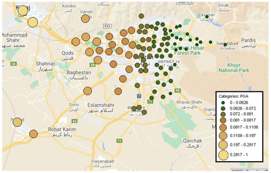 The results for the peak ground acceleration (PGA) of the bridge exposed to recordings No. 1 and 10 are shown in Figure 7 and Figure 8, respectively. It should be noted that the risk analysis process and PGA calculation for all bridges at each stage of the damage assessment and risk mitigation plan are performed by the software at high speed and for all earthquakes. The results shown in this section serve as examples for a better understanding of the process.