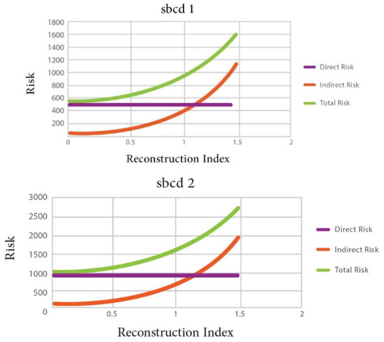Variations of direct, indirect, and total risk versus changes in the reconstruction index for models sbcd1 and sbcd2.