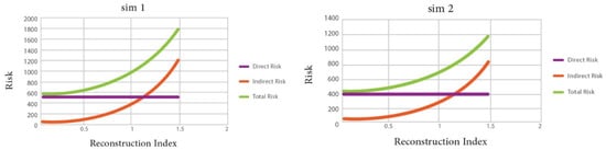 Variations of direct, indirect, and total risk versus changes in the reconstruction index for models sim1 and sim2.