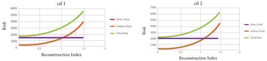 Variations of direct, indirect, and total risk versus changes in the reconstruction index for models cd1 and cd2.