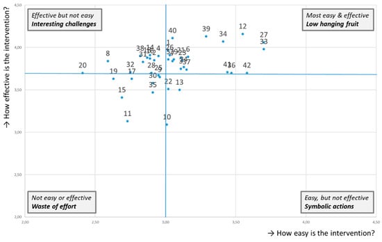 The questions on the perceived effectiveness and ease of the interventions were recoded with a value of 1 to 5 for the five answering options. In the analysis, the study then followed an ‘intervalist’ approach, in which data collected with an ordinal scale were processed as interval data [48]. The collected data was analyzed using SPSS, employing several statistical procedures. These procedures primarily included the analysis of means and standard deviations (SD), as well as the use of a scatter plot to integrate the perspectives of ease and effectiveness. The interventions were classified into four distinct groups, namely, low-hanging fruits, interesting challenges, symbolic actions, and waste of effort, based on the four quadrants of the scatterplot. For the establishment of the minimum baseline, the effectiveness and ease scores for each intervention were summed up and then ranked based on their combined “effectiveness + ease” score. All interventions with a combined score greater than 7 were included in the set of minimum baseline interventions. Furthermore, correlation analysis, an independent samples t-test, and one-way ANOVA were conducted to examine any potential influence from demographic variables.