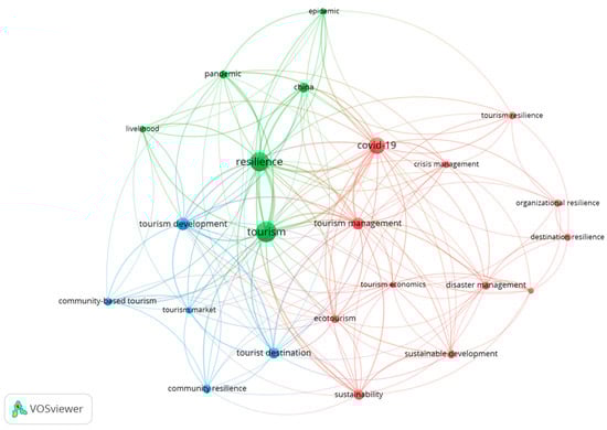 The main objective of a bibliometric study is to explore the themes and research trends in a predefined field, thus determining the most popular terms and the relationships between them [43], and this cannot be achieved without conducting an analysis of the keyword occurrences. Co-word analysis is a content analysis method based on the co-occurrence patterns of keywords in a manuscript collection. Its aim is to recognize the links between the ideas present in the themes addressed in the textual corpus. This approach has enabled the creation of a strategic diagram highlighting the relative relevance of topics related to the resilience of the tourism sector after the spread of the COVID-19 epidemic. The VOS viewer allows us to map the network of the most frequent keywords in our article selection [44]. A total of 23 keywords with a frequency of ≥ 5 co-occurrences were selected from 724 keywords (Table 2). As shown in Figure 3, a network representation of these keywords is generated by the program. The most common keywords are represented by circles, as the size of the circle increases the more frequently the term appears, while the links indicate the associations with the words, and the nodes of the same color group form a cluster of keywords. The thickness of the links shows the strength of the links; the greater the thickness, the greater the strength of association between the words and the frequency of their existence in the same publication. The distance between the two nodes is a negative function of the number of occurrences between the keywords.