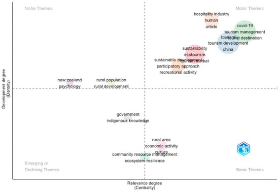 Motor themes (upper-right quadrant): sustainability, sustainable development, ecotourism, China, COVID-19, tourism management, tourist destination, ecotourism; although these are developed and relevant themes, they are almost too general. Because of their high centrality and density, they are the main topics for structuring a research field. Niche themes (upper-left quadrant): rural population, rural development, psychology, and New Zealand; these have well-developed internal links but few external links. These themes therefore have a high centrality but a low density, and their contribution to the development of the tourism resilience field remains marginal. Emerging or declining themes (lower-left quadrant): governance and indigenous knowledge; these themes are still at an embryonic stage within the theme of tourism resilience in the wake of the COVID-19 pandemic. The themes of community resource and ecosystem resilience seem to be emerging but cross-cutting with the basic themes, indicating that some of the topics within these themes are necessary to develop the field of tourism resilience. Basic themes (lower-right quadrant): rural area, economic activity, and culture; these are low-density, high-centrality themes that cut across this area of research.