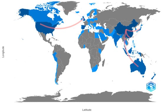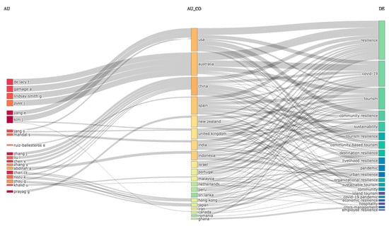 The Bibliometrix or Biblioshiny Program allows researchers to export from the Scopus database a three-field plot of their choice; we preferred to examine the relationship between authors, countries, and keywords to get a clear idea about the scientific community on this topic [44]. As shown in Figure 5, there is an interaction between authors (left), countries (middle), and keywords (right) in the field of tourism industry resilience. In summary, U.S. researchers are interested in issues related to the resilience of community-based tourism to the SARS-CoV-2 pandemic; Chinese researchers are interested in the resilience of the livelihoods of households residing in tourism villages; and the Australian community is focusing on the resilience of tourism to the COVID-19 pandemic. This explains the increased interest of researchers in the topic under study (Figure 6).