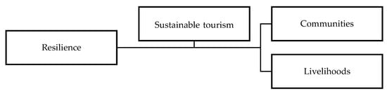Based on the study of keyword occurrences, a conceptual framework is suggested that brings together the three themes of resilience in sustainable tourism, communities, and livelihoods that can be tested in further research (Figure 8).