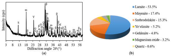 XRD pattern (a) and the results of QXRD analysis (b) of belite clinker sample. Indexes: β—larnite; m—mayenite; M—magnesium oxide; Y—ye’elimite; S—srebrodolskite; G—gehlenite.