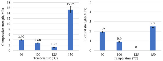 In the first step of steam curing, the belite cement mortar samples were cured in the temperature range of 90–200 °C, and the exposure duration was 24 h. The influence of the high-temperature exposure effect on the formation of the belite cement hydrates was investigated by XRD and DSC analysis. It was found that after hydrothermal curing at 90 °C temperature, the compressive strength of belite cement mortar samples achieved 3.92 MPa, and a flexural strength of 1.9 MPa (Figure 2).