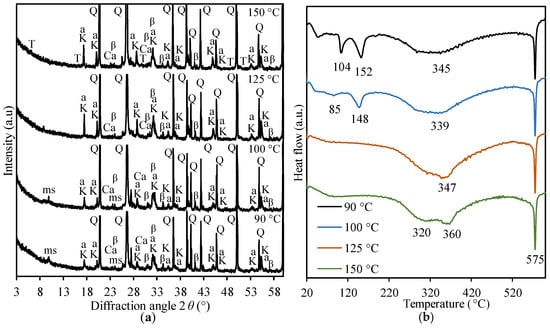 XRD patterns (a) and DSC (b) curves of belite cement mortar samples after hydrothermal curing. Indexes: β—larnite; Q—quartz; K—katoite; T—1.13 tobermorite; Ca—calcite; a—calcium aluminium iron hydrosilicate; ms—calcium monosulfoaluminate.