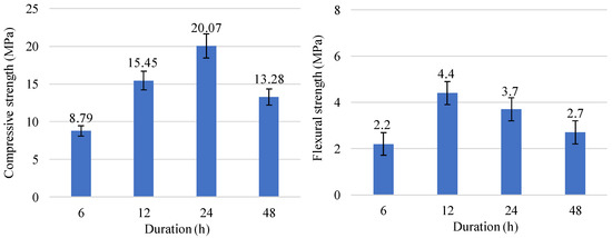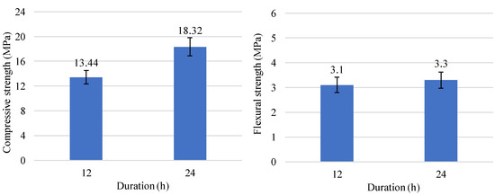 Further temperature increase to 175 °C enhanced the strength properties of belite cement mortar samples to 18.32 MPa compressive strength and 3.3 MPa flexural strength (Figure 4). Moreover, it was determined that a reduction in isothermal time to 12 h negatively impacted the compressive strength values of belite samples, as they decreased about 1.4 times (Figure 4). According to the results of the XRD, the formed amount of crystalline 1.13 tobermorite had the highest impact on the strength properties of the belite cement samples, i.e., after a reduced processing duration, a decreased intensity of the main peak of 1.13 tobermorite was observed (from 455 cps to 394 cps) (Figure 5). It is worth highlighting that under these curing conditions, hydration of larnite significantly accelerated, i.e., the intensity of the diffraction peaks decreased about 70–78% (Figure 5 and Table 3).