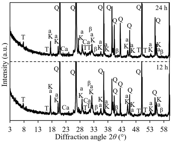 XRD patterns of belite cement mortar samples after hydrothermal curing at 175 °C temperature. Indexes: β—larnite; Q—quartz; K—katoite; T—1.13 tobermorite; Ca—calcite; a—Calcium aluminium iron hydrosilicate.