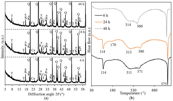 XRD patterns (a) and DSC curves (b) of belite cement mortar samples after hydrothermal curing at 200 °C. Indexes: β—larnite; Q—quartz; K—katoite; T—1.13 tobermorite; Ca—calcite; a—calcium aluminium iron hydrosilicate.