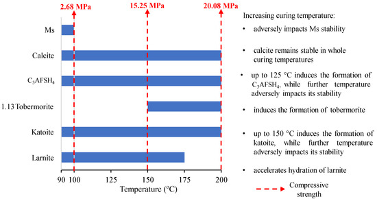 The results of XRD and DSC confirmed that the identified initial strength properties (at 90 °C) are mainly related to the formation of C4AŜH12, C3AH6 and C3AFSH4. Meanwhile, the adverse effects on the compressive strength after curing samples at 125 °C was probably associated with inner solid-volume changes led by the decomposition of calcium monosulfoaluminate. The increment in compressive strength at ≥150 °C was related to the hydration of larnite and the formation of crystalline 1.13 nm tobermorite.