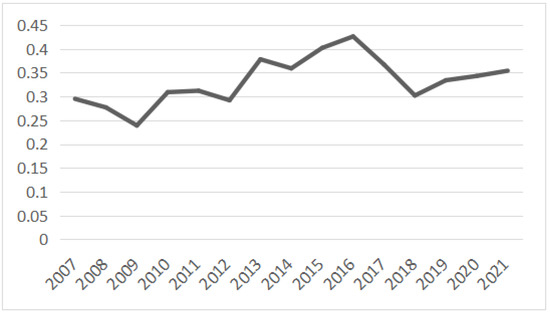 With the long-term aim of achieving sustainable development, green investment is also referred to as environmental investment, environmental, social, and governance investment, socially or sustainably responsible investment, or responsible investment, a concept that suggests that green investment is an investment activity that protects the environment, reduces pollution, reduces carbon emissions, uses alternative energy sources, and conserves natural resources []. Other scholars consider green investment to be a broad term that exists at all levels: investments in underlying technologies and projects, green companies and financial products that invest in these projects, or even entire asset classes. Green investment can also stand alone or be a subset of a broader investment theme or closely related to other investment approaches [].