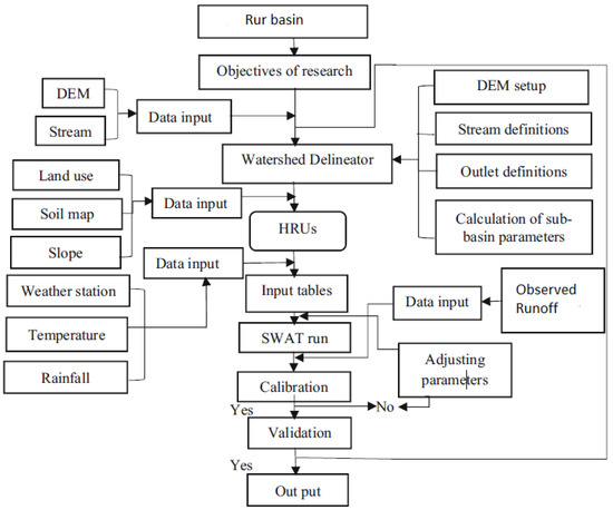 Basin delineation is used to divide the basin into smaller sub-basins, called sub-basins with the stream reaches and directions. The digital elevation model is used when the basin delineation and flow directions (upstream and downstream) are decided. Sub-basin numbers are generated and are used as references throughout the SWAT simulation. On the stream network, sub-basin outlets are created, where water accumulates in the sub-basin to become stream flow. In this study, 27 sub-basins were created. The stream network for the Rur basin was delineated using the digital elevation model in the ArcSWAT 2012 software. Figure 2 shows a flowchart of the SWAT model’s implementation.