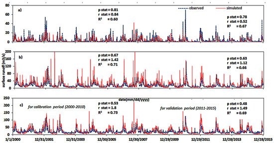 Figure 3 shows the comparisons of runoffs between simulation results and observed data for the calibration period (2000–2010) and validation period (2011–2015) at all three stations: (a) Monschau, (b) Linnich, and (c) Stah. The model’s performance during calibration and validation was the best at the Monschau station, followed by Linnich and Stah stations. This is evident as the statistical performances are satisfied from the performance statistics (R2, p, and r value) in Figure 4 and Table 1. The key reason for this can be a relative increment in the anthropogenic interventions as we move from the Monschau station in sub-basin 21 to the Stah station in sub-basin 1. From the land-use map, it is evident that the northern part of the basin has much more agricultural and urban land than the southern part of the basin. Water use by the urban population, industries, channel diversions, and dams are not considered in this model but can significantly affect the stream flow in the northern parts of the basin. This can explain why the Monschau station has better performance statistics than the other two stations in regard to both calibrated and validated values. Further, one land-use map was used to calibrate the model for all the years in which the scenario was not a real case. Our simulation was performed at a daily time step, and all absolute values of PBIAS in calibration periods were less than 25%, thus being satisfactory (Table 1). Moriasi et al. [70,74] suggested that an absolute value of PBIAS of up to 25% was satisfactory at a monthly time step. At the basin scale, the result was consistent with other studies (runoff was simulated and compared with the base-level scenario simulation for the individual gauging stations also).