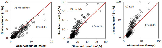 Correlations between observed vs. simulated runoff values for the three stations: (A) Monschau, (B) Linnich, and (C) Stah.