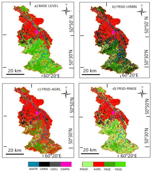 Land-use map of different scenarios: (a) base-level scenario, (b) deciduous forests (frsd) to urban residential area (urbn) conversions, (c) deciduous forests (frsd) to agricultural area (agrl), and (d) deciduous forests (frsd) to grasslands (rnge).