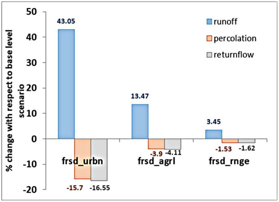 In the frsd_urbn scenario, the simulation results showed that the long-term average runoff increased by 43.05% from 94.48 mm in the base-level scenario to 135.15 mm in the frsd_urbn scenario in the entire basin (Figure 6). This was mainly due to the decrease in percolation from 249.83 mm to 210.61 mm after scenario application. The results also showed that the average runoff in the entire basin increased by 13.47% for the frsd_agrl scenario and 3.45% for the frsd_rnge scenario (Figure 6). This was primarily attributed to decreased percolation in all the scenarios. The decrease in percolation was highest for the frsd_urbn scenario because the impervious surface increased after scenario application. However, the average yearly runoff values decreased for the frsd_urbn scenario at Monschau and Stah while they increased at Linnich station.