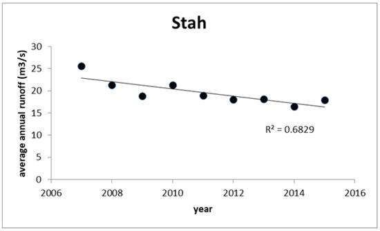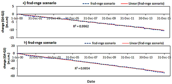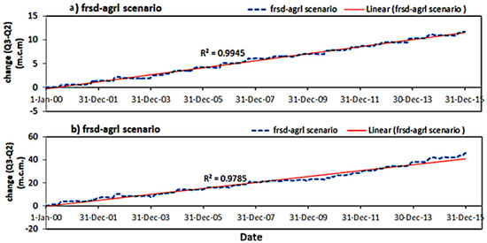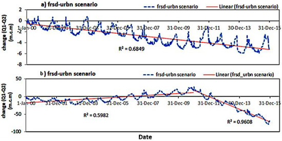 Figure 7 shows the time series plot of the relative change (with respect to the base level) in the cumulative stream flow for the period from 2000 to 2015. It was found that there was pronounced seasonality in this scenario. The relative change in the cumulative flow showed a decreasing trend (Figure 7a). This signifies that less water for this scenario will be available from stream flow than that for the base-level scenario at Monschau station. However, at Linnich, the change increased first and then decreased (Figure 7b). There was a peak when the linear trend line fitted in the time series dataset. However, the change showed lower seasonality compared to that at Monschau station. This means that the upstream was more sensitive to seasonality than the downstream. This was consistent with the results in Table 2. In Table 2, the average percentage change in the daily runoff was a positive value of 7.42% at Monschau station while it was a negative value of −6.47% at Linnich station and −9.42% at Stah station. This means that the average daily runoff increased at Monschau station and decreased at the other two stations compared to their baseline level. To obtain a sense of variability in the average daily runoff values, the standard deviation for the daily relative change was calculated to be 56% at Monschau station (%) but 29.87% at Linnich station. This meant that there was a lot of variability observed in the daily runoff values at Monschau station. This can be explained by the fact that when the forests were removed, there was a relatively quick runoff response to rainfalls at a daily time step. The high value of variability can be explained due to the location of the Monschau station in the forested area, with steeper slopes and shallow soil layers.