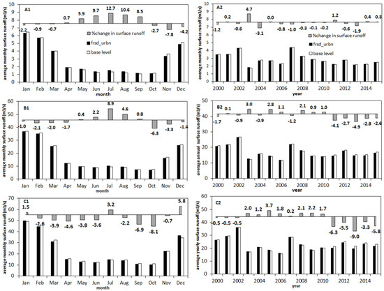The relative changes in the average monthly runoff (A1,B1,C1) and average annual runoff (A2,B2,C2) for the stations Monschau represented by (A), Linnich (B), and Stah (C). All graphs in this figure are for frsd-urbn scenario.