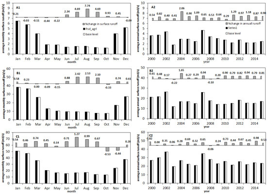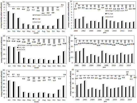 The percentage change in the average long-term (16 years) runoff was calculated using the formula