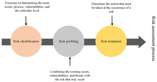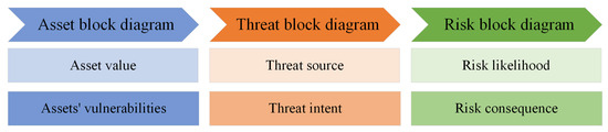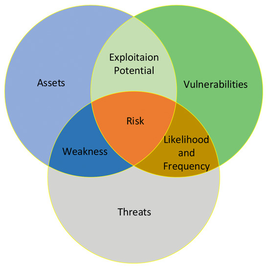 Risk can be quantified as a function of the possibility that an attack will occur by taking advantage of an existing weakness and the influences of such attacks on a certain system’s functionality [6]. The relationship between the three basic pillars of any risk—vulnerabilities, threats, and assets—is depicted in Figure 2. A threat can take advantage of an asset’s flaws, and any asset that has weaknesses is susceptible to exploitation. The likelihood and frequency of a threat’s recurrence can be used to assess the relationship between the threats and the assets’ existing vulnerabilities. The sum of all the aforementioned factors results in the system’s current potential risk.