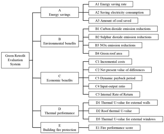 The urbanisation process in China is relatively late compared to developed countries. Building renovations are still in the development stage. In contrast, research on building renovation and energy efficiency in developed countries has been relatively mature. Therefore, besides China’s Green Building Evaluation Standard, reference is made in this paper to the US Green Building Evaluation System (LEED) and Healthy Building Standard (WELL), the UK Green Building Evaluation System (BREE-AM), and the German Sustainable Building Evaluation Standard (DGNB). These standards have been used as the basis for the evaluation of residential retrofit solutions. This paper selects the five evaluation dimensions of energy saving, environmental efficiency, economic efficiency, thermal performance, and fire performance for the comprehensive evaluation of residential building renovation. After determining the evaluation dimensions, 16 evaluation indicators were chosen to form the evaluation system through discussions among 22 experts and scholars in the relevant fields of architecture, as shown in Figure 1.