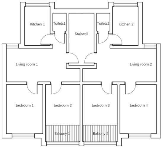 The basic building parameters are designed for lighting energy consumption of 5.0 W/m2, power of household electrical equipment of 10.0 W/m2, heating cop of 0.850 and cooling cop of 2.50 in the HVAC system, room air changes of 0.7 (ac/h), personnel density of 0.05 persons/m2 and human heat dissipation of 100 W/person (factor = 0.9). Home time is set from 18:00 to 8:00 on weekdays and all day on rest days. The heating temperature of the bedroom is 20 °C, and the cooling temperature is 26 °C. Under normal circumstances, buildings in cold regions only need to consider energy consumption for winter heating. As the elderly account for many occupants in older homes, the above-mentioned basic parameters were set with the physical condition of the elderly in mind, and summer air conditioning was added for cooling. This paper establishes a typical building model based on research, as shown in Figure 2 and Figure 3, and the thermal parameters of a typical building are shown in Table 2.