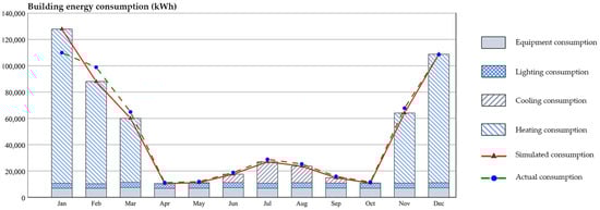 The actual annual energy consumption of the building is 573,557 kWh and 221.3 kWh/m2 calculated from the list of heating and power distribution in Shenyang. The energy consumed by central heating in winter accounts for 68% of the annual energy consumption of the building, which is in line with the energy consumption characteristics of a typical building in a cold region [40]. DesignBuilder simulates the typical building model. The simulated energy consumption is 563,987 kWh per year, with 217.6 kWh/m2. The difference between the typical model and the actual energy consumption is only 2.7%. The electricity consumption of the actual building is calculated based on the total distribution capacity. It is clear from Figure 4 that the actual electricity consumption is slightly higher than the simulated electricity consumption in the summer when there is no heating energy consumption. In summary, the typical building model established above correctly reflects the energy consumption of the actual building throughout the year.