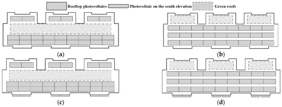 Figure 5. Photovoltaic and greenery laying method. (a) The first type of roof laying; (b) Second type of roof laying; (c) Third type of roof laying; (d) Fourth type of roof laying.