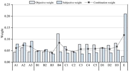 As the entropy method can only determine the weight of each indicator through information entropy, the objective weights derived will be distorted. The subjective weights of each indicator need to be corrected by using expert scoring. The least squares method optimizes the objective and subjective weights to produce the composite weights. The weighting and combined weight of each indicator are confirmed using the following equations: