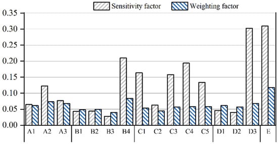 Sensitivity analysis was performed on the indicators according to the highest scoring option 5, with the levels of factor variation taken as 20%, 10%, −10%, and −20%, respectively. As the sensitivity analysis was mainly used to verify the stability of the model and the degree of influence of the analyzed indicators on the evaluation results, the sensitivity coefficient was taken as the maximum value of each indicator under four levels of factors to verify the least stable situation of the model. The results showed that the maximum value of the sensitivity coefficient among the 16 evaluation indicators was only 0.31. The ranking of the best and worst solutions of the model did not change during the sensitivity test, so the model has good stability. A grey-scale correlation analysis was done on the sensitivity coefficient and the weight coefficient, and the correlation was high at 0.78, and the two trends were close to the same in Figure 7.