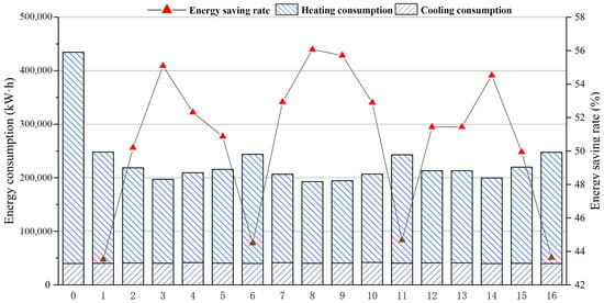 The building under study is located in a severely cold region, and the primary energy consumption of the building is the cooling load generated by air conditioning in summer and the heating load generated by coal-fired central heating in winter. The energy-saving rate visually reflects the overall energy-saving effect of the building retrofit. In contrast, the electricity and coal savings reflect the savings in cooling load in summer and heating load in winter, respectively. The formulae for calculating energy efficiency, electricity, and coal savings are as follows:
