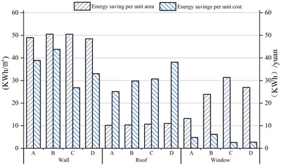 Regarding thermal performance, the best energy savings among the three exterior envelope retrofit measures are polyurethane exterior wall insulation, glass wool roof insulation, and triple Low-E filled Arg exterior windows. The best economic performance was achieved by EPS insulation panels, glass wool insulation panels, and double-layer Low-E filled Arg exterior windows. The energy savings per unit of life-cycle retrofit cost are 43.8 kWh/Yuan, 38.1 kWh/yuan, and 6.2 kWh/yuan. The three envelope retrofit measures have the highest energy savings of 26.8 kWh/yuan~43.8 kWh/yuan for external walls. The lowest energy savings are for exterior windows at 2.7 kWh/yuan~6.2 kWh/Yuan, with the cost of retrofitting far outweighing the benefits.