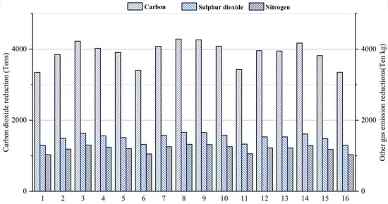 Environmental benefits are mainly derived from building energy efficiency and green roofs, which effectively reduce the buildings’ winter heating energy consumption by enhancing the thermal insulation of the external envelope, thereby saving coal and reducing pollutant emissions. Pollutant gas emission reductions for each program are shown in Figure 10. Approximately 99% of the pollutant reductions in this study came from building energy efficiency. The installation of green roofs and the laying of photovoltaic panels require some optimization. Each square meter of green roof reduces 256 kg of CO2 over the lifetime of the building. At the same time, a green roof improves the thermal environment and effectively reduces the roof temperature in the summer. Due to the different laying methods, each square meter of photovoltaic panels in this study can bring 2396 Yuan~2645 Yuan over the whole life cycle of the building, while the benefit of laying roof photovoltaic panels is more significant than laying south elevation of the building. Based on the combined weighting, the economic benefits are weighted more heavily than the environmental benefits. Therefore, photovoltaic panels are prioritized over green roofs for roof retrofit measures in severely cold regions.