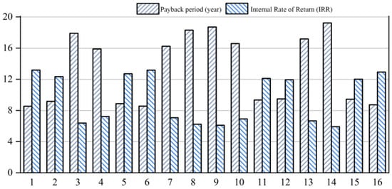 The energy price growth rate is the second parameter. Because the energy price is increasing, the transformation benefit is mainly the electricity cost saved by air conditioning cooling in summer, the coal cost saved by collective heating in winter, and the electricity sold through PV. The price of coal is 1.5 yuan/kg, and the earnings of photovoltaic electricity are 0.97 yuan/kWh (basic tariff of 0.55 yuan and subsidy of 0.42 yuan). According to the change in electricity and coal prices in Shenyang, the adjustment value of electricity and coal prices in this paper is 5%. According to the Chinese standard, the social discount rate is affected by the bank loan interest rate, which is 8%. Combining the energy price growth rate and the social discount rate, the actual discount rate in this paper is 2.86%.