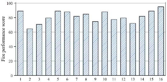 Fire prevention is according to the standard Chinese GB8624-2012 [43]. This study uses the insulation material fire rating, which belongs to the A level of insulation materials: expanded perlite, glass, and rock wool insulation. The phenolic resin insulation board belongs to the B1 class. The XPS insulation board, EPS insulation board, and polyurethane insulation board belong to the B2 level. Using the Formula (13), according to the experts’ ratings, the highest score for fire performance is for the combination of rock wool and roof glass wool, and the lowest score is for the combination of XPS insulation board and roof XPS insulation. The results of the fire performance score are shown in Figure 13.