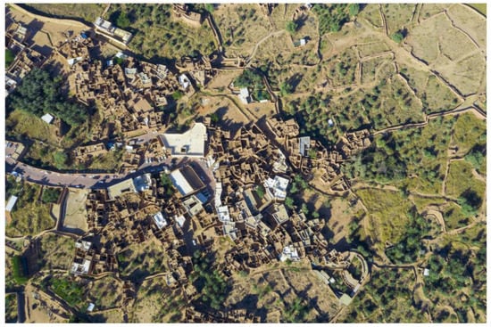 Aerial view of the village showing the central square with arterial roads. Residential houses and surrounding agricultural lands where several buildings are still in need of restoration are located in the center (source https://heritage.moc.gov.sa/en/points-of-interest/ushaiger-heritage-village, retrieved 17 April 2023).