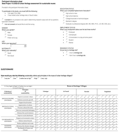 A questionnaire (Scheme 2) was designed for a small area survey to assess the sustainable reuse of urban heritage. The questions were based on the main pillars of social, cultural, environmental, and economic criteria promoted by the United Nations General Assembly [51] and the United Nations Educational, Scientific and Cultural Organization (UNESCO-ICOMOS) [63,64] to compare the selected cases studies and assess how the urban heritage intervention reached different levels of sustainable reuse. The small area survey was conducted by involving different participants into an open access questionnaire (Scheme 2) that was approved by Prince Sultan University’s Institutional Review Board (IRB, Approval Letter of Authorization on Research Ethics: PSU IRB-2022-09-0123, dated 1 October 2022).