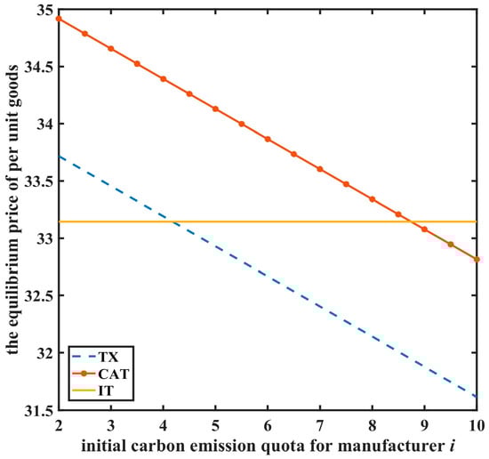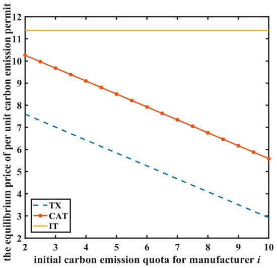From the equilibrium results in Table 1, we can see that the differences in optimal price of the carbon market and optimal carbon emission quantity, the optimal price of the goods market and the optimal production quantity, and the optimal carbon emission rate caused by three different emission abatement policies mainly depend on the relative value of manufacturers’ initial carbon emission intensity and the average initial carbon emission intensity , as well as the relative value of the coefficient of carbon emission cost and the average coefficient of carbon emission cost . The intuitive understanding behind this lies in that for industries or areas with lower attention to carbon emissions, enterprises generally have a higher emission rate. Meanwhile, implementing an intensity target policy can achieve a better result to control carbon emissions through unit emission rates. For enterprises or areas with better carbon emission management, the cap-and-trade policy can usually achieve a better result to control carbon emissions through the total volume of carbon emissions.