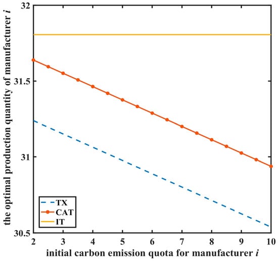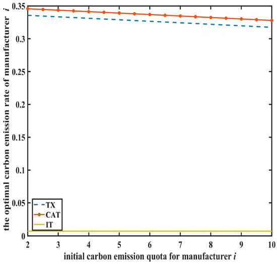 We assume that the initial carbon emission intensity of manufacturer and − satisfies that , ; thus, we have , and we assume that the average emission permit output . We assume that , ; thus, we have . Furthermore, let , and . Let the unit carbon emission cost be and the unit production cost be . Let and thus . Therefore, we can compare manufacturer ’s optimal decisions with the changing initial carbon emission quota.