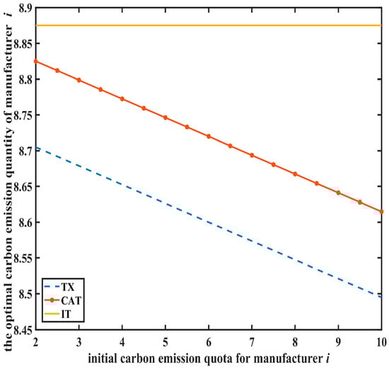 The results comparisons of the optimal carbon emission quantity of the manufacturer are shown in Figure 4. We can obtain that the optimal carbon emission quantity under the intensity target policy is larger than that under the cap-and-trade policy. For the manufacturers with lower initial emission intensity, the cap-and-trade policy has the incentive to decrease the carbon emission quantities.